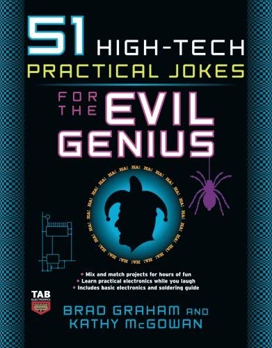 "51 High-Tech Practical Jokes for the Evil Genius "provides you with all the instructions, parts lists, and sources you need to pull hilarious pranks, such as: Evasive random beeping things Dripping faucet simulator Hungry garbage can critter Humungous dropping spider Horrible computer failure TV remote control jammer Possessed animatronic doll Flying Ouija board Voices from the grave The barbecue box Ultrasimple pulse shocker Disposable camera taser Ghost door knocker Radio station blocker And many more!