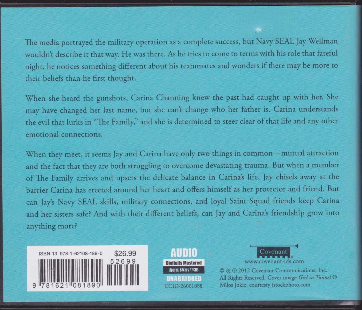 The media portrayed the military operation as a complete success, but Navy SEAL Jay Wellman wouldn't describe it that way. He was there. As he tries to come to terms with his role that fateful night, he notices something different about his teammates and wonders if there may be more to their beliefs than he first thought. When she heard the gunshots, Carina Channing knew the past had caught up with her. She may have changed her last name, but she can't change who her father is. Carina understands the evil that lurks in "The Family," and she is determined to steer clear of that life and any other emotional connections. When they meet, it seems Jay and Carina have only two things in common-mutual attraction and the fact that they are both struggling to overcome devastating trauma. But when a member of The Family arrives and upsets the delicate balance in Carina's life, Jay chisels away at the barrier Carina has erected around her heart and offers himself as her protector and friend. But can Jay's Navy SEAL skills, military connections, and loyal Saint Squad friends keep Carina and her sisters safe? And with their different beliefs, can Jay and Carina's friendship grow into anything more?