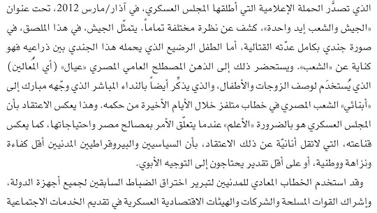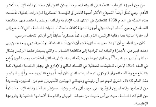 هذا البحث الرائع يفنّد جمهورية الضباط في مصر وتدخلّاتها في الدولة واحتمالية تحوّلها إلى دولة خفية في المستقبل وهذا ما حدث فعلاً، بالإضافة إلى محاولاتها لإعاقة الخدمات العامة التي تقدّمها الحكومة المنتخبة ديمقراطيا ومحاولة اسقاط الحكومة. وآخر الكلام: أحّا، الكتاب هذا منشور قبل الإنقلاب بسنة