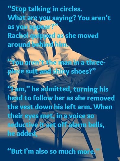 "I want you to willingly want every single thing I plan to do to you. I want you to keep your hands behind your back because you want to." Biting her earlobe, he then added, "And I want you to swallow because you love the fucking taste. Play with me, Rachel, so I can play with you."