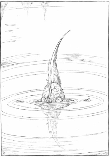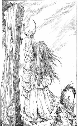 3 The Slaughterer's Quest - Keris (future mother of Rook Barkwater) with white skin and black hair looks not like the rest of the tribe with hair and skin red from smokesheds, but like skypirate father Captain Twig, gone ten years. Visiting short scaly webfoot goblins communicate by color-changing crests, and in their home lake, tend a ginormous clam as old as life itself p246, who will know whether Twig lives, so she returns, past dangerous crevasses infested with hungry blind tendrilled white goblins p209, bite healed by transparent spindlebug Tweezel, for the answer in a caterbird cocoon on Lullabee Isle.
