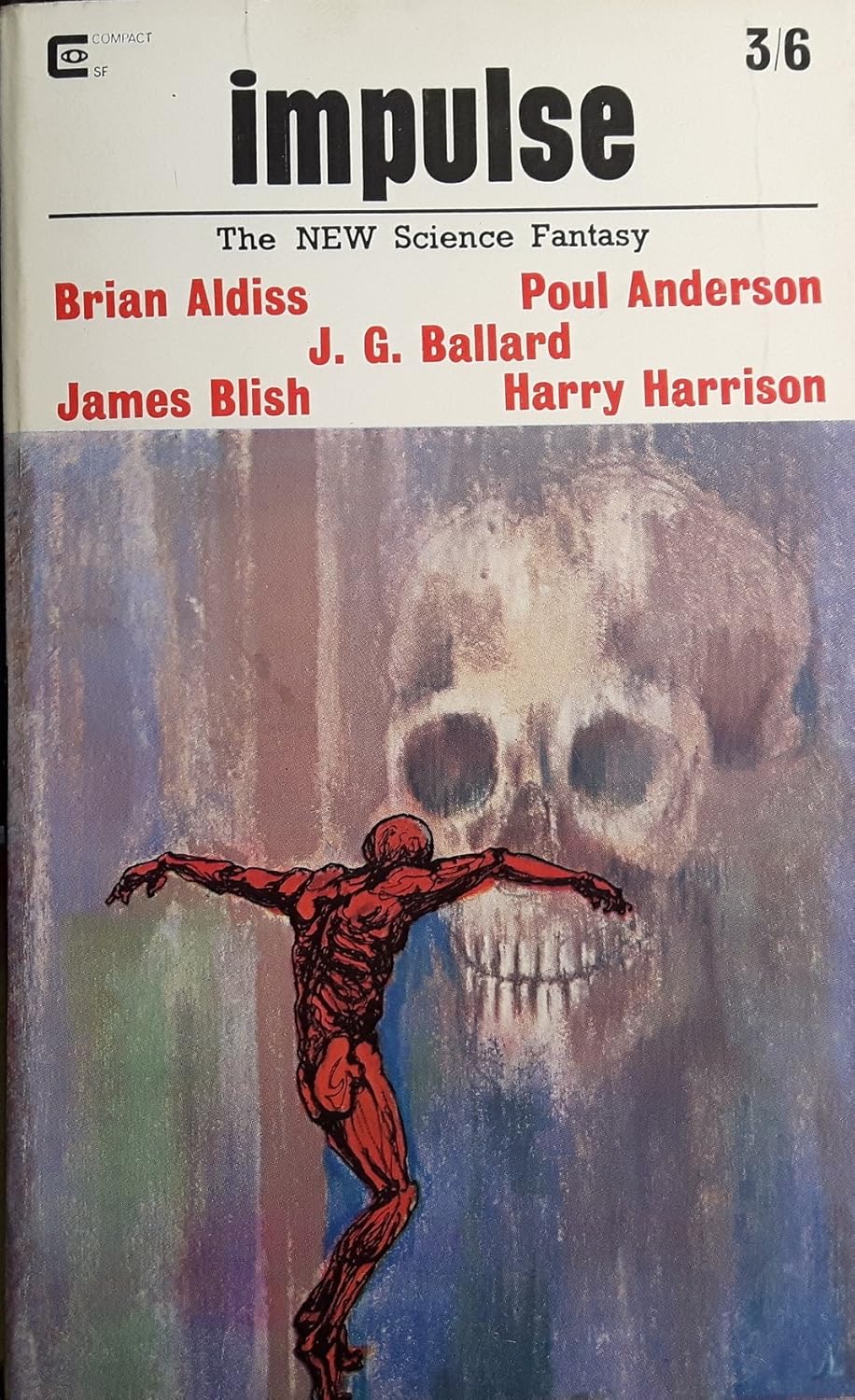 Cover of Impulse Vol 1 No 1. Note the coffee-cup shaped mark, the creases, and the scrawled in '50c'; clearly this is in mint condition.Perhaps life was too simple. Perhaps Bonfiglioli needed a challenge, or perhaps it was just a thought bubble, but the decision was made to retitle the magazine. To make it longer, more expensive and with a new, vague name that didn't really tell the reader what was inside; thus was born Impulse. The idiocy was later dulled by trying to call it 'SF Impulse' but the damage was done, circulation fell, and when the distributor went under and the publisher came under pressure, Impulse had made itself vulnerable and had to go.