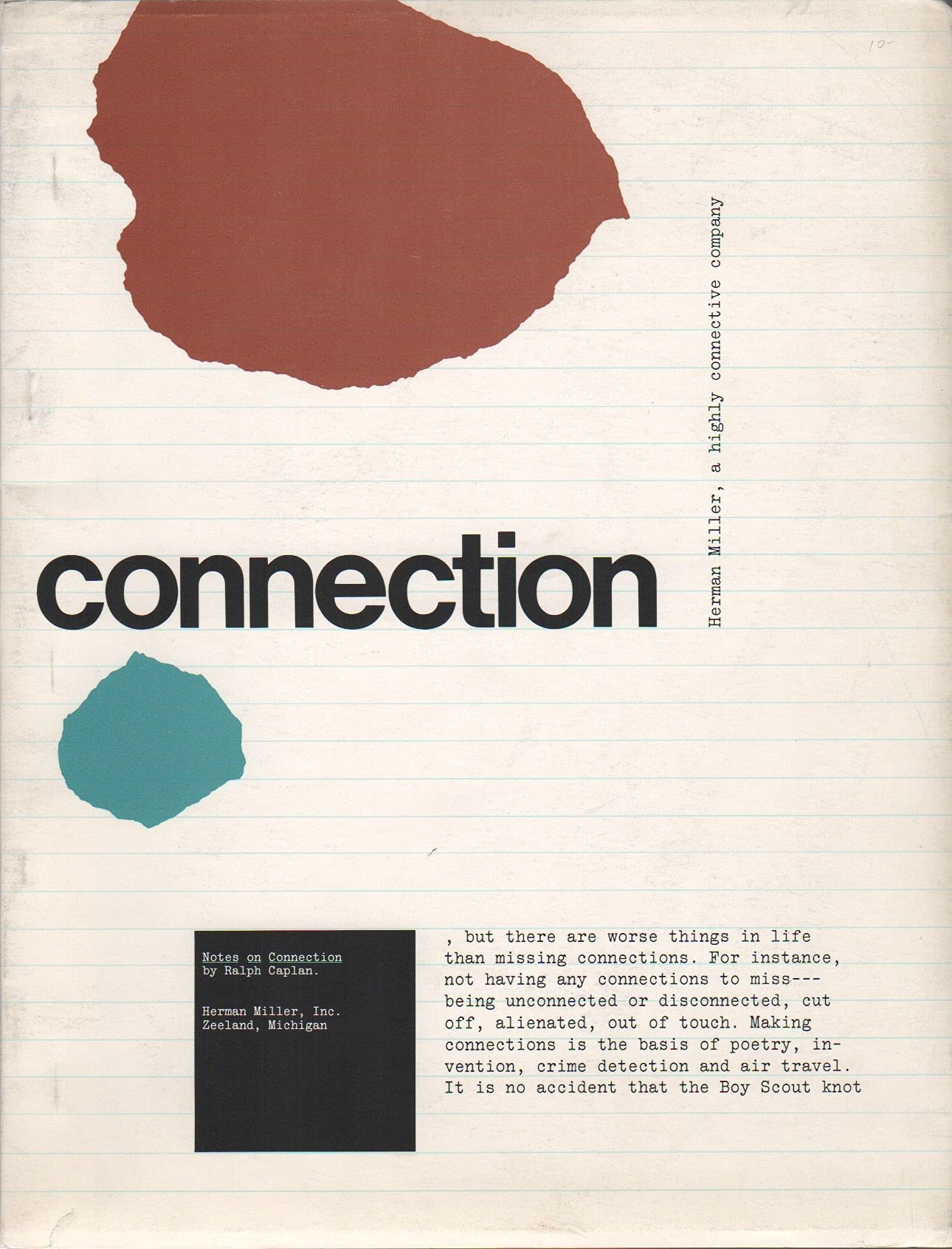 One of four publications created for Herman Miller Incorporated, in very limited quantities by the great design thinker Ralph Caplan, published by and for Herman Miller of Zeeland Michigan, and beautifully designed by the great John Massey. All four began with the words..."some incomplete thoughts with room for improvement, by Ralph Caplan." The others in the series begin ATTENTION. TENSION. And OMISSION. They are Caplan's musings on industrial design relative to CONNECTION. ATTENTION. TENSION. And OMISSION. All are RARE as they were only published for in-house distribution by Herman Miller.