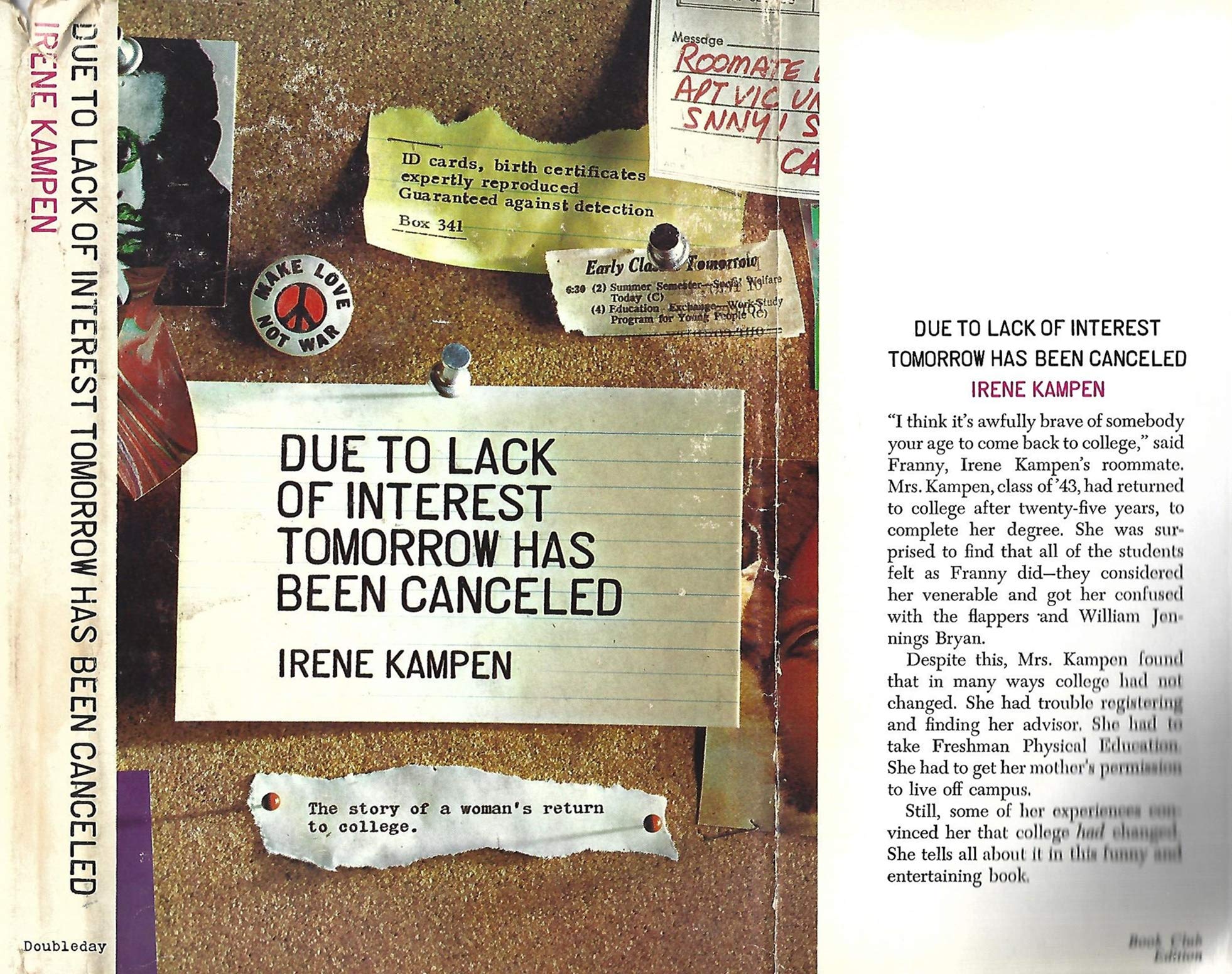 This is the story of 40-something Irene Kampen's return to the University of Wisconsin to complete the six credit hours she requires to finish her degree in journalism. Kampen left the University of Wisconsin in 1943, returing in 1968 at the height of campus radicalism. This book is a fictionalized version of her true life experiences. She has created some interesting and amusing characters and provides a gentle satire of "the generation gap" and university life in the 60s. She also deals with some surprisingly frank issues. Kampen's book *Life Without George* tells the story of her divorce. This book inspired *The Lucy Show*, which featured a recently divorced Lucille Ball (who is presented in the show as recently widowed rather than recently divorced).