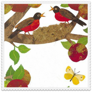 I love the bright colorful illustrations and simple, easy breezy flow of text across each page. It kind of reminds me of the hungry caterpillar book. I love the way the book teaches kids about the biology of how apples grow from the flowers on the tree. I liked the story of the robins hatching from their eggs and then growing feathers and learning to fly, which occurs while the apples on the tree are ripening. The front end papers show the pink apple blossoms against a blue background, and quite fittingly, the back end paper shows big ripe apples against the same sky blue background. I also enjoyed the mirthful expressions on the faces of the 2 sisters and their cat. Really a delightful book that I can imagine any adult will enjoy reading with a child.