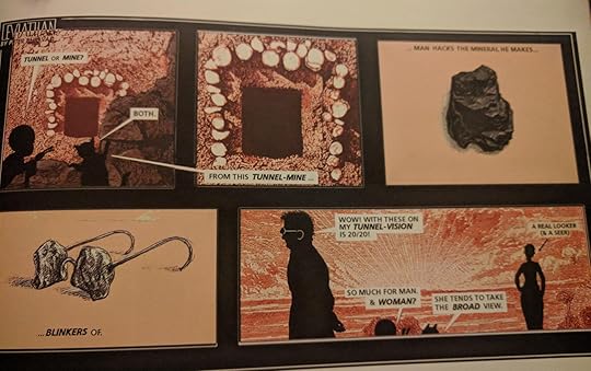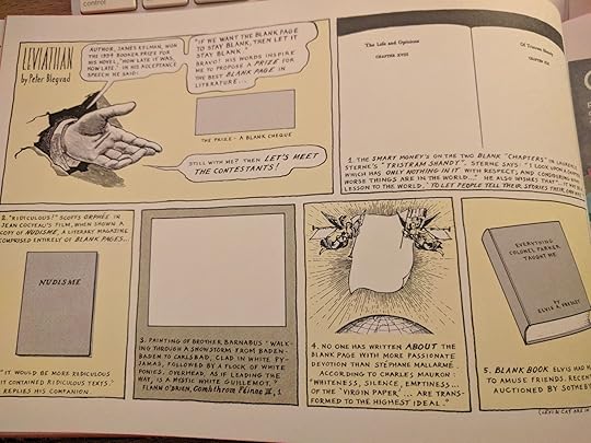 This book is a kind of compilation of strips he did in London in the nineties. And it reflects his weird reading framework, his bizarreness, his lightheartedness, his philosophical nature and goofiness. For instance, on one page he reflects, divergently, on best blank pages in novels, such as a couple pages on Laurence Sterne's Tristram Shandy, pages that invite readers to construct their own aspects of the story.