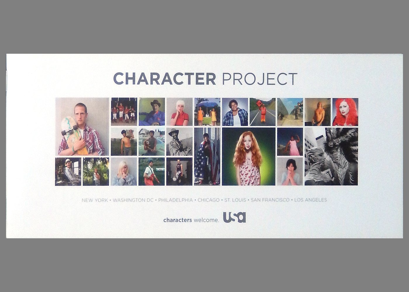 A promotional booklet issued to announce the Character Project and introduce the photographers who participated. Character Project is "an ongoing artistic initiative to celebrate the extraordinary people, from all walks of life, who make this country unique. USA assembled a team of 11 world-class photographers to capture the character of America during the summer of 2008." The photographers, each of whom has written a one-page artist's statement and who is represented by a sample of their work, Dawoud Bey; Anna Mia Davidson; Jeff Dunas; David Eustace; Joe Fornabaio; Mary Ellen Mark; Eric McNatt; Eric Ogden; Sylvia Plachy; Richard Renaldi; and Marla Rutherford. The subjects Renaldi's photos of fishermen in Alaska; Davidson's organic farmers in the Pacific Northwest; summer parades in NYC by Mark; the life of Columbia College students in Chicago by Bey; Eustace's portraits of men and women he found along U.S. 50; musicians of Michigan by Ogden; and beauty queens of Texas by McNatt. An exhibition toured the US in 2009. Staple-bound card covers; 16 pages; color photos throughout; 10 x 4.5 inches.