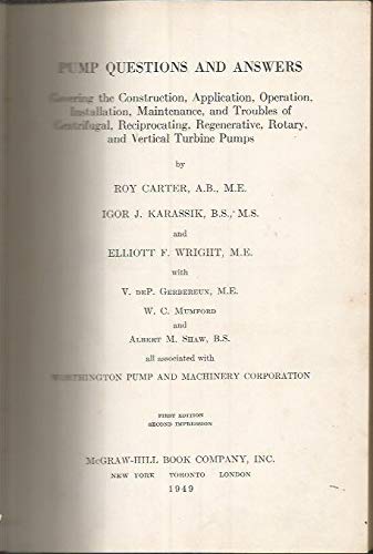 Pump Questions and Answers - covering the construction, application, operation, installation, maintenance, and troubles of centrifugal, reciprocating, regenerative, rotary, and vertical turbine pumps,