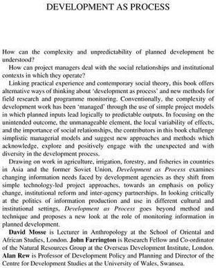 Process" approaches to economic and social development appear to be more flexible and offer greater prospects of success than traditional "project" methods. Development as Process addresses the questions raised by the different natures of the two approaches. The authors examine development projects through experience in water resources development in India and in organizational learning by a Bangladeshi NGO. Inter-agency contexts are examined in the setting of an aquaculture project in Bangladesh and in the setting of agriculture and natural resources development in Rajisthan, India. Finally, the role of process monitoring is explained in the context of policy reform, with illustrations from forestry in India and land reform in Russia.