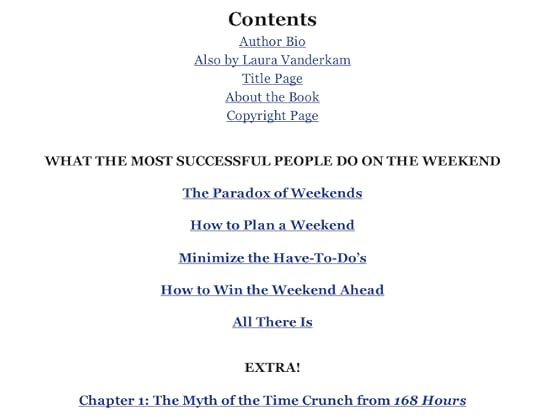 I read her blog for a while (but she comes off as really pretentious on it), then I read her next book "All the Money in the World" - which appeared to be put together in a hurry so I did not really enjoy that, but again, because I loved 168 Hours, I decided to buy this one for $2.99 and see what it is about and while I was reading (took me 30 minutes to read the whole thing - it is so short, most bloggers offer such e-books for free!) I felt really angry. Yes, I know 2.99 isn't a huge amount of money, but this book offers nothing new at all. You should plan your weekends, you should get up and do things, and then it gives you a few examples of supposedly successful people who do the same. Really? And I paid for this???