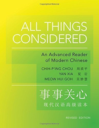 Designed for students who have completed at least two years of college Chinese, this thoroughly revised edition of All Things Considered bridges the gap between intermediate- and advanced-level Chinese. Lessons promote student discussion and include thought-provoking topics relevant to contemporary Chinese society, such as the increasing divisions between the rich and poor, the conflict between economic development and environmental protection, and changing attitudes toward sex and marriage. The first twelve lessons in the book are in dialogue form, while the remaining lessons are adapted from Chinese newspaper and magazine articles, exposing students to spoken and written styles of Chinese. Some topics appear in both the dialogues and articles sections, giving students ample opportunity for review and reinforcement, improving their overall grammar and vocabulary retention. With a new user-friendly format, All Things Considered juxtaposes text and vocabulary on adjacent pages. Grammar explanations and exercises have also been fully updated to meet student needs.
