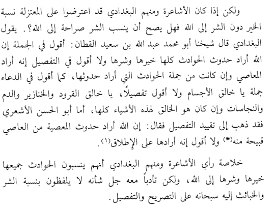 هكذا بدأت الحاجة الملّحة في ظهور مذهب وسطيّ للحد من استخدام المعتزلة للعقل وطبيعي أن يكون صاحب هذا المذهب ومؤسسه هو الأشعري، لتذبذب آراءه وحيرته قبل التحول وعدم إيجاده لأجابات شافية في بعض أفكار المعتزلة إلى أن خلع عنه تمامًا أفكاره الإعتزالية وبدأ في تكوين مذهبه الجديد الحقيقة أنه لا يمكن الحديث أو التأريخ لمذهب الأشاعرة دون الرجوع إلى المعتزلة، وعقد مقارنات بين هذا وذاك ورأي كل منهما في كل مسألة ليس فقط لأصول مؤسسه الإعتزالية، بل لأن أغلب المسائل التي ناقشها المذهب الأشعري هي مسائل تعرض لها المعتزلة بالقول والتفصيل والتوضيح والتطوير، فتجد الأشاعرة يخالفوهم في بعضها ويقوموا بتعديل البعض الآخر وإيجاد رأي وسطيّ بعيدًا عن مغالاة المعتزلة في تحكيم العقل وإغفالها لقصور العقل البشري عن إدراك الحكمة الإلهية إلا أنني أرى أنهم في محاولتهم تعديل آراء المعتزلة والذهاب بها لنقطة وسط، ابتعدوا عن الوسط ذاته وقاموا بالتسليم في أشياء كثيرة وترجيح النقل على العقل أحيانًا رغم رغبتهم في الموازنة بينهما ومنها 1-نظرية الكسب التي صراحة لم أستطع لها فهمًا ولم أقدر على تفكيك ما بها من تناقض الله خالق الفعل والعبد مكتسبه أليس هذا نوع من الجبر؟ أين الوسط في ذلك إذن؟ وفي نسبة الشر إلى الله سبحانه وتعالى وإن كان يُنسب مجملاً مع كل الأعمال، أليس هذا أيضًا جبر؟ لم يحل الأشاعرة هذه المعضلة ولم أجد في الكتاب ولا في نظريتهم عن الكسب كيف سنحاسب وفقًا لمبدأ الجبر ونسبة الأعمال خيرها وشرها إلى الله سبحانه وتعالى! ونظرية صفات الله ليست عين ذاته ولا غير ذاته، لم أستطع فهم تناقضها هي الأخرى!!