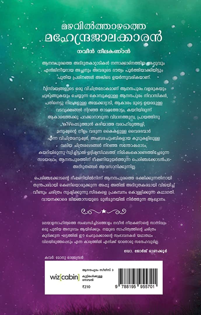 Book 3 in Anandapuram Series. Adventures of Appu in Anandapuram. A thrilling adventure Novel for kids in Malayalam. This is a story book in Malayalam for children who loves adventure and fantasy stories like Harry potter. അദ്ഭുത കാറ്റാടികള് നന്നാക്കാന് ആനന്ദപുരത്ത് എത്തിയ അപ്പുവും എഞ്ചിനീയറായ അച്ഛനും സമയരഥത്തിലേറി തിരുവനന്തപുരത്തേക്ക് തിരിച്ചു പോവാന് തയ്യാറെടുക്കുന്നു. അതേ സമയത്ത് പലവലിപ്പത്തിലും നിറത്തിലുമുള്ള വര്ണ്ണ മയിലുകള് ആനന്ദപുരത്ത് പ്രത്യക്ഷപ്പെടുന്നു. ആനന്ദപുരത്തിന്റെ അദ്ഭുത ലോകത്ത് പുതിയ രഹസ്യങ്ങളുടെ, വിസ്മയങ്ങളുടെ വാതില് തുറക്കുകയാണ് അപ്പു ഈ നോവലില്. കുട്ടികളുടെ പ്രിയപ്പെട്ട ആനന്ദപുരം സീരീസിലെ മൂന്നാമത്തെ പുസ്തകം. തീര്ത്തും ത്രസിപ്പിക്കുന്ന കഥാഗതിയോടെ അപ്പുവിന്റെ യാത്ര തുടരുകയാണ്. മലയാള സാഹിത്യത്തെ സംബന്ധിച്ചിടത്തൊളം നവീന് നീലകണ്ഠന്റെ സാന്നിധ്യം ഒരു പുതിയ അനുഭവം ആയിരിക്കും. നമ്മുടെ സാഹിത്യത്തിന്റെ ചരിത്രം കുറിക്കുന്ന ഘട്ടത്തില് ഈ ചെറുപ്പക്കാരന്റെ സംഭാവനകള് യഥാതഥം വിലയിരുത്തപ്പെടും എന്ന കാര്യത്തില് എനിക്ക് യാതൊരു സന്ദേഹവുമില്ല. -ഡോ. ജോര്ജ് ഓണക്കൂര്