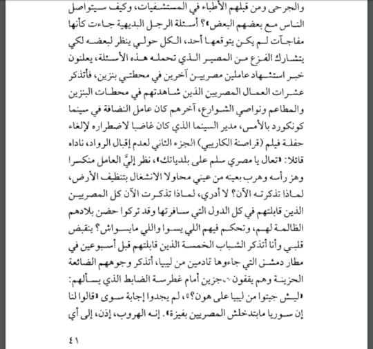 2006 .. كنت صغيرة إلى حد كبير ( و الآن صغيرة فقط ) وقت أن قصفت إسرائيل لبنان ..و أذكر القليل جدًا عن العملية التي أسرت بها جماعة حزب الله جنديين اسرائليين .. و للحق أشعر تمامًا بكل ما شعر به سائق التاكسي الذي تحدث عن الزج ببلد كامل في الحرب .. من قبل موقف حزب الله المقيت تجاه ما يحدث في سوريا و تأييده لبشار الأسد و أنا لا أحب حزب الله ..و لم أشعر يومًا بالراحة تجاه حسن نصر الله أو الجماعة بوجه عام بالرغم من قلة معلوماتي عنها بيد أنني لم أحبها يومًا .. ثم إن قلبي انكسر و الآن بعد مرور أعوام ثمانية على استشهاد العمال المصريين في لبنان و ما قد حدث لأهلهم و ما يحدث الآن ..مهلا ..كان الحدث في يوليو و في فبراير 2006 كان حدث غرق عبارة السلام و لم يحدث أي شئ فكيف أكون بمثل هذه السذاجة لأتوقع أن يحدث شئ لعشرات .. يتلخص الوضع العربي الذي كان و يكون و سيكون إلى أن يشاء الله في موقف الجندي الذي يصمم على أن يأخذ مبالغ مالية ..( الهدية يا بيه ..الحلاوة . رشا ..و غيرها من المسميات ) .. سفارة مصرية ..( يا راجل كبر مخك ..سفارة ايه و هري فاضي ايه ) ..أحي الكاتب على أنه لم يكن من أولئك الذين يؤمنون بأننا أم الدنيا و أن السفاررة ستهب و ب ( بكل الهري الفاض يده ) لأنه لو قامت حرب عالمية ثالثة و حرب ابادة شاملة تستهدف المصريين بالذات لما تحرك ساكنًا لأي مسئول في مصر أو خارجها ..( عشان منحسش بالغربة في أي حتة ..متداس علينا برا و جو الحمدلله ..) ذكر اسم صلاح عيسي أصابني بالغثيان -_- ..