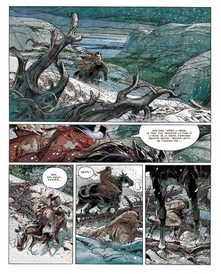 The art by Boucq is still beautiful, especially the colouring, which emphasises moods rather than trying to be realistic at all times. And the visual storytelling nigh faultless. Reading this makes me realise just why French comics are the best at capturing western stories. The over-sized album format is perfect for the open landscape panoramas that this genre thrives on, better than the smaller American formats of comic books, trade paperbacks and graphic novels, and much better than the even smaller Japanese tankobons.