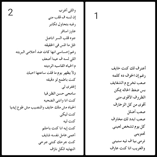 “أنا الدمعة اللي تتمنى في لحظة تموت وتخرج من عيون قاسية فليه تسألني ع الأيام برغم مرورها بالعافية ؟ ولو راح تنسى مره أنا مين أنا خيبة أمل ماشية !!”
