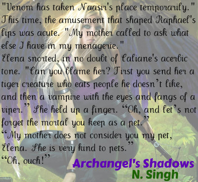 Warm and strong, his scent earthy and familiar, he made the bruises inside her hurt less, her muscles no longer as taut.Anyway, the best part of Archangel's Shadows was just hanging out in the Guild Hunter world. Elena's anxiety over her mother-in-law's visit was so entertaining, as were her interactions with Naasir . . . whose book is next!
