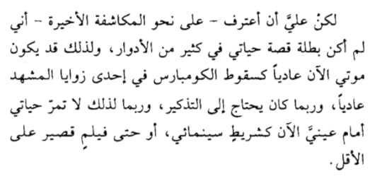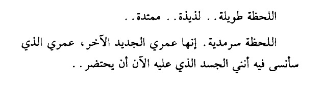 " في البداية ربما لا يمكن تصديق هذه المسألة، أن العقل يتذكر لعشرين دقيقة بعد الوفاة، قبل أن يمضي إلى فنائه النهائي، حتى وإن تكن صحيحة فعلاً فإننا لا نريد أن نصدقها، إذن لماذا نكتب؟ لسببين؛ لأن الفكرة ذهبت بنا إلى مكانٍ بعيدٍ في الرعب، وبقدر ما أخافتنا، بقدر ما أحببناها، لذلك نكتب عن هذه العشرين دقيقة، فالكتابة اختبرتنا كصغارها، ثم علمتنا أن نخلق أشياء صادقةً، وإن لم يكن لها من واقعٍ صادق ومساوٍ. الآخر..إننا نستحلي الكتابة لنخمن أمكنتنا من هذا الفضاء المريع؛ الكون!