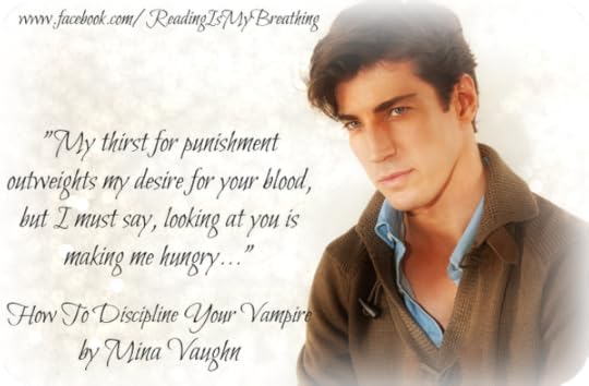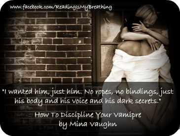 Mina Vaughn's How to Discipline Your Vampire is an interesting, but slightly strange story. In the beginning, I didn't really like Cerise she seemed a little too bitchy. She turns down submissives left and right for any little thing and it makes her seem downright mean. As I read more into the story a dark secret from Cerise's is revealed and it's actually a very traumatic incident, so much so that days later, I kept remembering that specific scene and how humiliating it would be. It took about halfway through the book for Cerise to grow on me. I enjoyed her relationship with William and I thought the role playing scenes that he came up with for her were sexy and fun. Although I've read this story was inspired by Twilight, William actually reminded me more of Bill from True Blood.