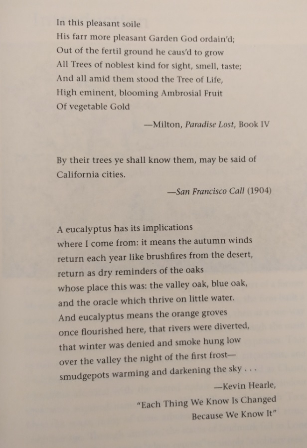In a book about trees and changing landscape, I did not expect the political undertone of racism and nativism. Not confined just to the Chinese, Japanese and Mexican workers, the principle was also applied to the plant world. Should non-native species be removed to restore natural habitat? How long must an “immigrant” tree reside in the state before it can truly be considered part of its natural vegetation?
