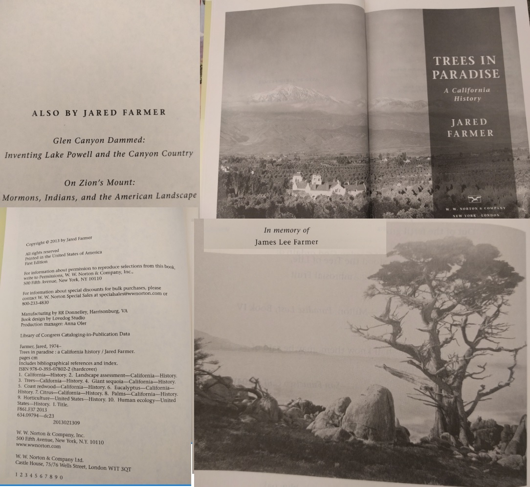 Jared Farmer, has written a unique and interesting book on the changing landscape of California from Gold Rush days to the present. If it was not for the subtitle, A California History, one might presume that Trees in Paradise is simply a botany book. Although the book’s focus is on the big trees (redwoods and giant sequoias), the eucalyptus (from Australia), orange trees and palms, there is much more. Associated with the four major themes are a myriad of lesser topics including lumbering, Save-the-Redwood League, agribusiness, immigration, postwar building boom, freeways and smog.