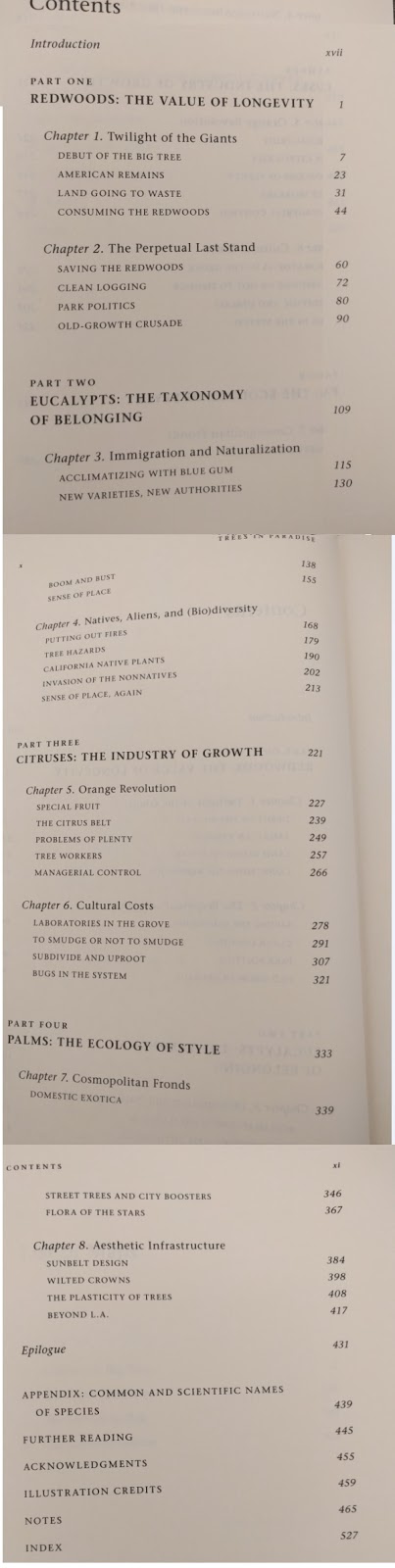 Part I: Redwoods – ideas of time, history, antiquity, and mortality. Part II: Eucalyptus – immigration, naturalization, nativeness, and alienness. Part III: Citrus – labor, industry, replication, and growth. Park IV: Palms – beauty, fashion, image, and style.