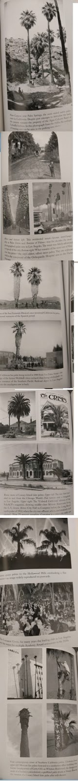 PALM TREES OR SHALL WE SAY "TREES": Did you know palms are more closely related to grasses (e.g. bamboo) than trees?!? I didn't. Another amazing thing I learned was that, unlike most (true) trees, palms pretty easily survive transplanting and thus can be sold at mature or near-mature height from property to property like a carved mantlepiece, stained-glass window, etc. How perfectly adapted to the California sport of buying and selling real estate. Across the decades, palms have visually signaled a sort of "paradise" image of California and have thereby served as a sort of vegetable sales force for the real estate business.
