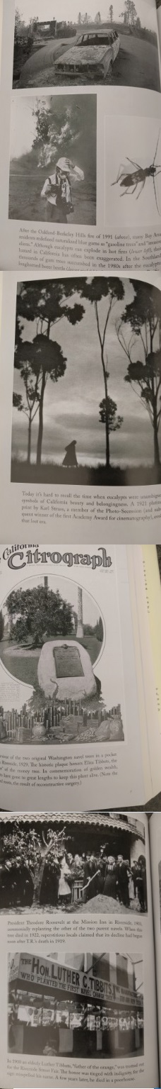For me, the book was especially engaging because I grew up in the Citrus Belt (now known as the Inland Empire). I remember taking short-cuts through the orange groves on my way to school. My family’s traditional summer vacation was spent camping at Sequoia National Park. I saw the General Sherman Tree – the world’s largest tree by volume. I was quite surprised to learn that before the General Sherman Tree became part of a national park, it was called the Karl Marx Tree. I also learned that in earlier times the planting of eucalyptus was believed to counteract the “miasma” or bad air that caused disease. The oil from the leaves was believed to be good for asthma, rheumatism and the “gleets – a detestable malady with an appropriately ugly name.”