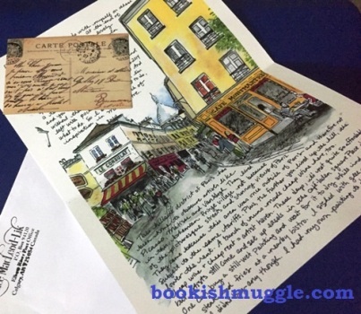 I ordered a Paris letter from the author’s Etsy shop and received a lovely painted letter from her in my mail. I am now planning to frame this letter and hang it on the wall. The painting is too beautiful! Janice is really talented and I am not surprised that she was able to switch her career easily to become an artist once she moved to Paris. I showed this letter to my husband and even he loved it. She has a pretty handwriting. My Paris letter from Janice -