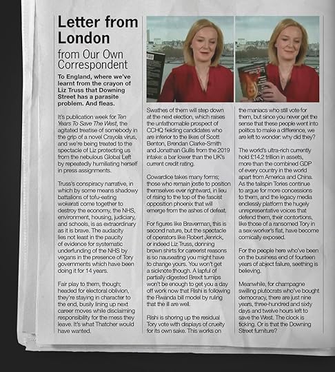 I wanted to read this to experience for myself just how unrepentantly awful this third-rate Thatcher tribute act Is - and Mad Lizzie sure doesn’t disappoint. Thankfully my library ordered this in for me as neither did I want to part with any money for it or have to don a disguise in order to purchase it from the bargain bin at my local bookstore. I did however want a big old belly laugh at her car crash calamity of a career. She really does hate China doesn’t she, along with pesky things like regulations to stop capitalism causing further environmental/financial carnage along with such trivialities as human rights and such. Marvel how she plans her first 100 days as Prime Minister but doesn’t even make it halfway, as the most useless UK government ever even had enough of her after just seven weeks. But, of course, nothing is ever her fault. Especially the bit during the 49 utterly insane days in which she was somehow allowed to lead the country that she found time to devise her amazing mini-budget - wiping out the UK economy to the tune of over £30billion. Thank goodness it wasn’t a maxi-budget, eh. This is what happens when you hand the reins of power over to a delusional right-wing Frankenstein monster vomited out from Tufton Street think tanks. Ten Years To Save The West? Liz couldn’t save her job within 50 days. However you can save precious time by not reading this utterly self-indulgent memoir of one of the most laughably incompetent, arrogant and clueless politicians of the modern era. Unless, like me, you delight in scrutinising the stupid, so if you do, I can highly recommend this book.