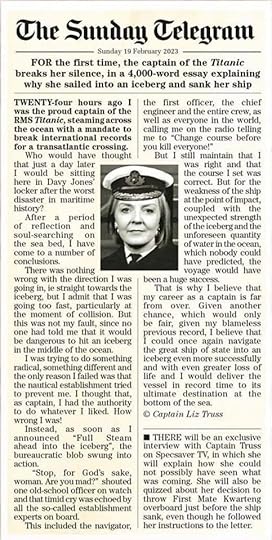 "In the annals of British decline, she will be remembered for having been in office just three days when Queen Elizabeth II died and for her plan for an enormous and apparently unfunded tax cut, which she abruptly dropped after a run on the pound." Tanya Gold IN: https://www.nytimes.com/2024/04/22/op...