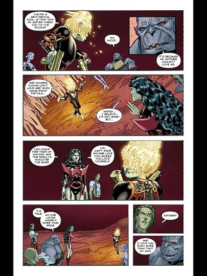 Finally, I must talk about my favourite part of the series, the character of Wonder Woman. As we see Superman revamped as a superpowered sociopath, Batman... being Batman and even Geoff john's psycho-Wonder Woman in the Justice League comics, I never believed it would take the guy who wrote 100 Bullets to let us remember that, at core, superheroes should be just really nice people. Yes, there is the odd bit... well, okay, a LOT of gore and splatter and pain in this book, but the character of Wonder Woman remains passionate, kind and optimistic. There's no attempt top 'Dark Knight' her. She doesn't mope and brood. I mean, yes there was a bit of that in Volume 1, but it was justified. Her mother had just been taken from her, she'd been rejected by her own people and her evil sister was taunting her about it. But, you know what, she comes back out of it with a smile on her face.She doesn't go around mashing people's skulls. My favourite part in the book is when she's forced to marry Hades. Hanging from her own lasso of truth and asked if she loves her demonic groom, she says, honestly, 'yes'. She then proceeds to escape, telling a confused hades that 'she loves everyone'. And she means it. Rather than beating up her captor, her final act to him is teaching him to love himself, the ultimate act of compassion performed in the most bad-ass way imaginable (thanks to Eros's magic bullets).