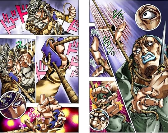 Ya se juntan Gyro y Johnny (que a mi parecer a pesar de que individualmente son personajazos, aún no demuestran mucha química como grupo), pero sobre todo, vemos las primeras peleas reales con stands (que al parecer son dentro de la trama aún un misterio) con 2 villanos derrotados y lo bizarro de Araki saliendo a flote con cosas como el chico que se estrangula solo para quitarse el veneno.