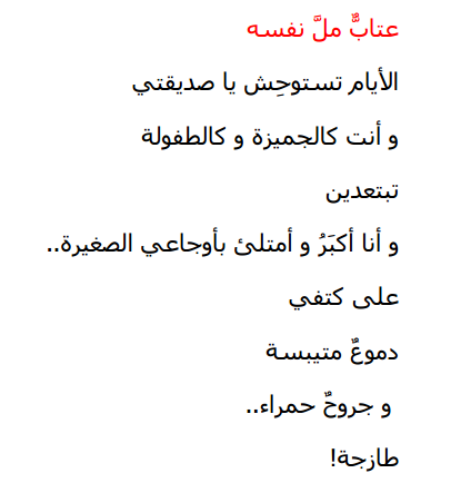 نحن ما زلنا نتسائل "لم لم يحمله ساعى البريد" فيأتينا الرد دائما "لأسباب غير معروفة" :) بسيط وعميق لكن هناك احساس انه ربما ينقصه شىء ! ------ ما العيب ان افعل ما اريد بلا شروح لبشريين انا فيّ و الله معي من قد يهمه أمري اذن؟