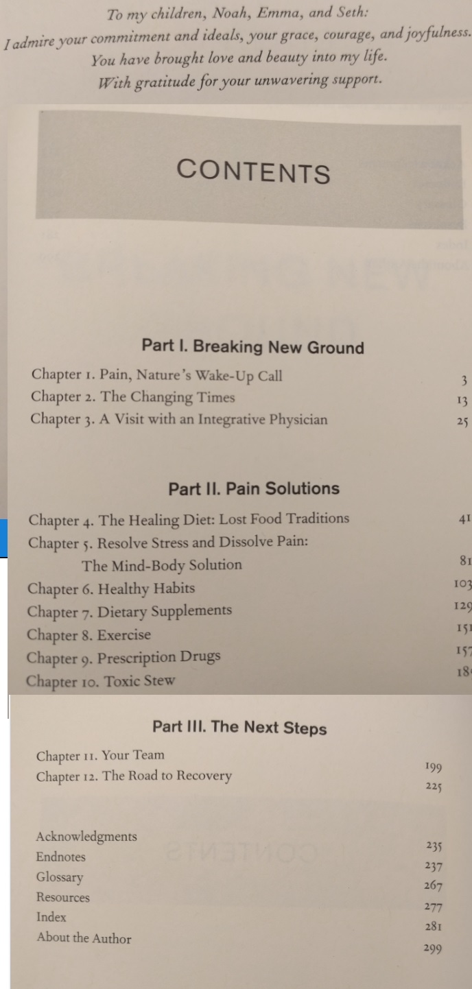 This is the table of contents. The book has three parts. In the first one, the author lays out the problem: there is pain, and the reasons: because we lead unhealthy and contaminated lives. The second part gives advice on good diet, eating clean, having good habits and, of course, exercising. The third and last part talks about having a support network to lead a better cleaner life,