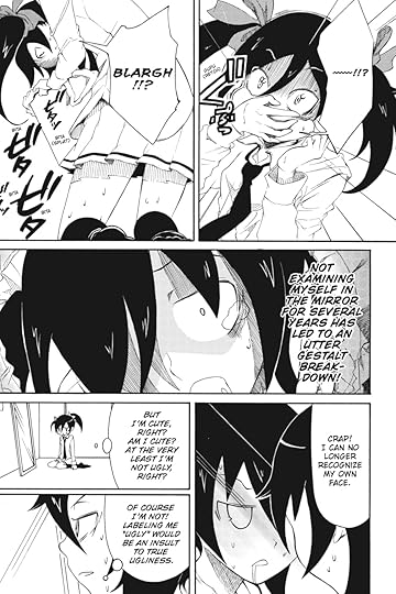 So what's driving interest? Well, it's a story 4channers can relate to. The main character, Tomoko Kuroki, is a total loser -- apart from one friend, she only spoke to another person six times in middle school. Now she's starting high school and she's been separated from her lone friend. So she decides to change herself and become super popular. Unfortunately she has no clue how to do this and her severe social anxiety often manifests in bizarre behavior. So it's the story of a loser being a loser -- and being a loser, and being a loser. There's really no let up. Tomoko doesn't progress at all in the first volume. She doesn't improve herself. She doesn't make friends. Apart from her brother, she hardly ever talks to other characters, and when she does she ends up embarrassing herself. This is a comedy, but it's a damn depressing one. Yet you can't help but keep reading in the hope that things will lighten up -- like Charlie Brown believing Lucy won't jerk the football away before he can kick it.