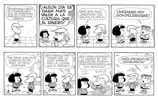 Mafalda is an Argentine comic strip that was popular in the 1960s and 1970s. Here in Buenos Aires (where I’m currently visiting), you see Mafalda everywhere, so I was glad I could get a Kindle version of one volume.