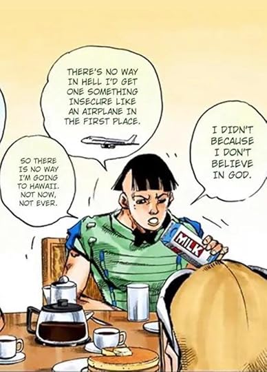 BORN THIS WAY??? GAGA??? sorry thats just..... araki ok king!! but once again just cool ass stands and the stand user is really cool. it just makes me wonder what the fuck the higashikata family is really at because ALL OF THEM sus ASF. and the eldest son is no where like.... also WHO THE FUCK IS JOSUKE. HIS OTHER HALF. UGH. SO GOOD. i literally love this part sm already