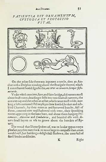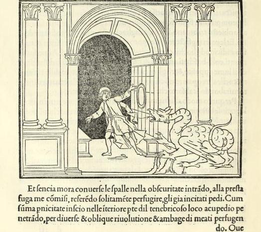 And I, Poliphilo, was lying on my couch, the timely friend of my weary body, with no one with me in my familiar chamber but the dear companion of my sleepless nights, Insomnia. She was consoling me after several conversations in which I had explained to her the cause and origin of my deep sighs; she kindly helped me to calm my uneasiness, then, realizing that the time had come for me to sleep, asked to leave.