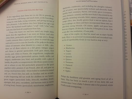 I liked her other book "French Woman Don't Get Fat" so I was hopeful with this one. Unfortunately, it was a disappointment. I alternated between thinking that what she said was very obvious or it did not contain enough details to be useful or I flat out disagreed with her. Some examples...Yes, it's best to have a good attitude. Duh. I could use some hints on dressing better for my age but I needed more details please! Don't agree with her position on vitamin D. In fact it made me question her credibility on everything else! I was so relieved when I got to the portion with the recipes because I could skip those pages without feeling like I was cheating. Anyway, I would have been happier if I passed on this entire book.