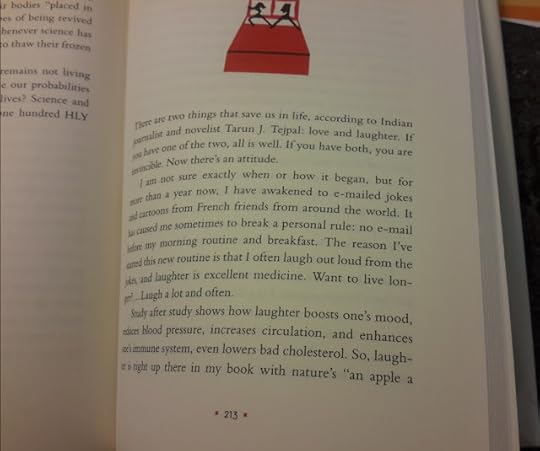I didn't always agree with everything she wrote; that would be impossible I believe. But I did find some great ideas about what to do in certain areas (like which clothes to invest money in), was convinced of how right(!) I am in others (avoid diets, just eat healthy foods and reduce portions to stay in shape), was motivated to add a few tips in my daily life (drink more water), and all in all, had a great time. It's apparent that the writer is a woman that's vibrant and very active, full of love for life, and that alone makes the reader see life in a positive, empowering light too. I liked reading the stories about her friends, her own life, which made the book feel more like a personal conversation between reader and writer, than a cold manual, or even a series of anecdotes sewn together just to show how popular and well connected the writer is (which is exactly the case with that other Francophile book I read).
