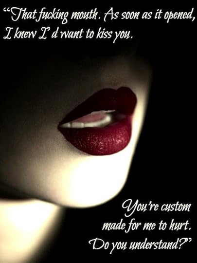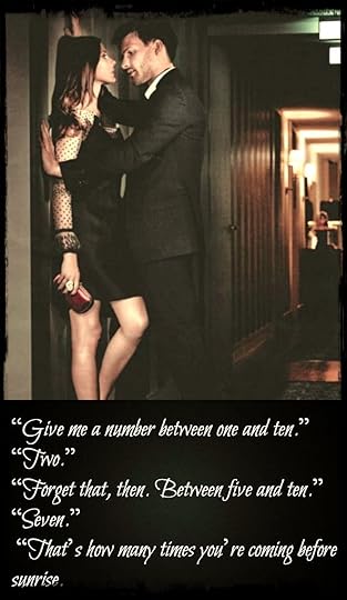 He shifted closer to me and spoke in a whisper. “I’m taking you home, and I’m going to tie your wrists to the banister. I’m going to blindfold you, then I’m going to undress you slowly. I’m putting my lips all over you until you beg me to take you, which I may or may not do.”