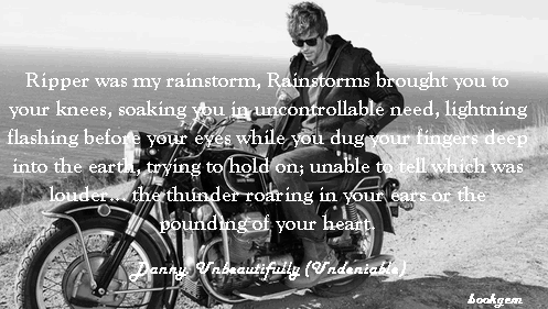 Danny finally makes him see that although he's all scarred up on the outside; those scars don't make him any less beautiful. Shee makes him feel alive and determined to truly start living again after feeling miserable and rather wishing he were dead for a very long time. He realizes he loved Danny, but their love is unconventional. They're not "supposed to" be together. Ripper is fourteen years older than Danny and a member of her father's motorcycle club and both of them *know* Deuce will never allow them to be together... They have to sneak around and when things start to get out of hand, their affair become messy and highly emotional.
