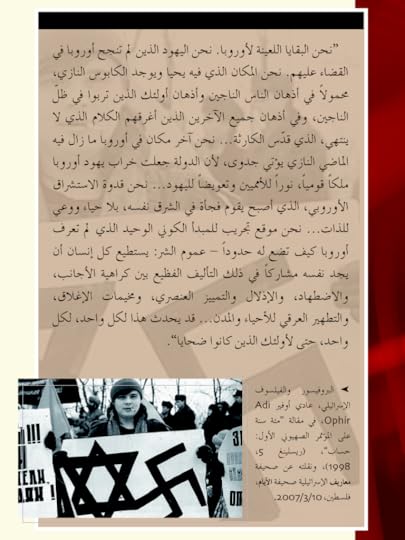 إنها المرة الأولى التي أقرأ فيها كتابا لمركز الزيتونة للدراسات والإستشارات.. كتاب يتناول بأسلوب علمي مؤثر موضوع العنصرية الإسرائيلية، بما في ذلك خلفياتها الدينية، وتصريحات قادتها، والممارسات الرسمية والشعبية ضد الإنسان العربي الفلسطيني، وخصوصاً في الأرض المحتلة سنة 1948. الكتاب أُسس على العديد من المصادر والأبحاث والدراسات - بالرغم من أنها ليست حديثة نسبيا (صدر الكتاب سنة 2008) إلا أنها بغاية الخطورة والأهمية .. لندرك معاني العنصرية بشكل أكبر من تلك المواقف اليومية التي يتعرض لها الفلسطيني!!