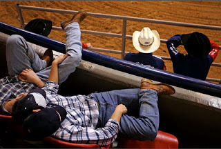 Photo Description: Two men in ball hats, plaid shirts, jeans, and boots sprawl in their seats in a rodeo grandstand. Their heads rest together and their shoulders touch, and the man on the right has his hand around the other man’s thigh. They are clearly friends, probably lovers. At the rail in front of and below them, three cowboys watch the action in the arena.