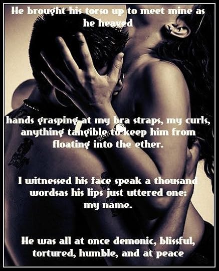 He brought his torso up to meet mine as he heaved, hands grasping at my bra straps, my curls, anything tangible to keep him from floating into the ether. I witnessed his face speak a thousand words as his lips just uttered one: my name again. He was all at once demonic, blissful, tortured, humble, and at peace.