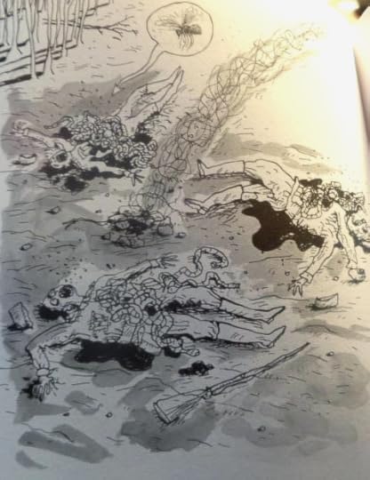 I'll admit that my familiarity with the Pixies and Black Francis' music is shallow at best, so I can't speak to this as a work reflective of any lyrical tendencies. In fact, my attempts to put the words of the occasional songs the characters break into with any sort of tune usually resulted in them being awkwardly coerced to fit nursery rhymes. Nonetheless, this is an interesting work, taking on shades of Stoppard and Gilliam in following Solider Boy as he traverses newly-minted fiction, lost fiction, speculative reality, and known reality. Confusing at times to be sure, and some of it required a couple passes to suss out what was happening; even then, I'm sure it would make more sense on screen, or at least be forced into some sort of visual sense on its way there. The art has a casual and expressive line to it, and in places can be absorbing as one tries to map the text to the image.