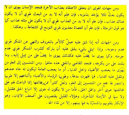 4- " وقد جربت نفسي أنني ربما أنظر في القضية زاعماً أنه لا هوى لي؛ فيلوح لي فيها معنى فأقرره تقريراً يعجبني، ثم يلوح لي ما يخدش في ذلك المعنى، فأجدني أتبرّم بذلك الخادش وتنازعني نفسي إلى تكلف الجواب عنه وغض النظر عن مناقشة ذاك الجواب، وإنما هذا لأني لما قررت ذاك المعنى أولاً تقريرًا أعجبني صرت أهوى صحته، هذا مع أنه لم يعلم بذلك أحد من الناس! فكيف إذا كنت قد أذعته في الناس ثم لاح لي الخدش؟ فكيف لو لم يلح لي الخدش ولكن رجلاً آخر اعترض علي به؟ فكيف لو كان المعترض ممن أكرهه!؟ "