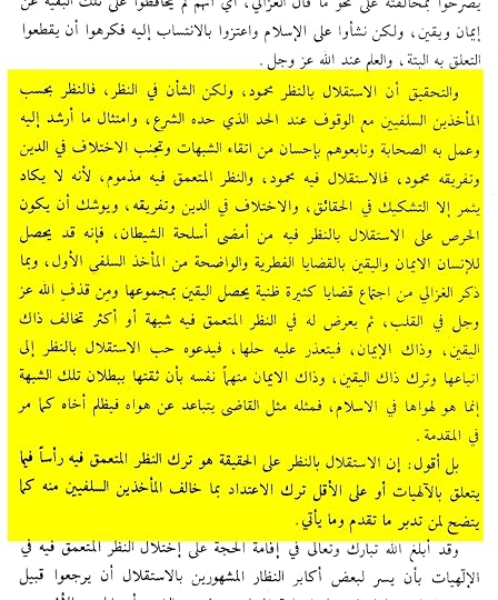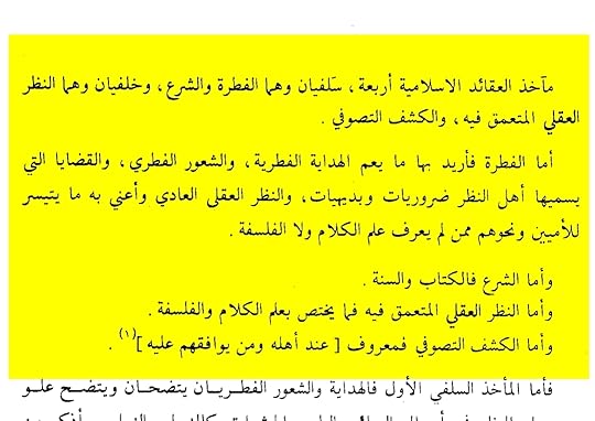 كتاب ثقيل ومهم، لكن به بعض الأبواب التي تستعصي على غير المتخصصين فيها بدأ بمقدمة طويلة جليلة في توضيح مسالك الهوى الخفية التي تناقض اتباع الحق، وهي جديرة بالقراءة والتأمل مما اقتبسته منها ثم الباب الأول في بيان المصادر التي تُستمد منها العقائد الإسلامية، والرد المفصّل على من زعم أن (علم الكلام والفلسفة) (والكشف الصوفي) مصدران من مصادر العقائد أصلاً، فضلاً أن يكونا مُقدّمين أو حاكميْن على الشرع والفطرة! وهو باب مهم حري بالقراءة هو الآخر