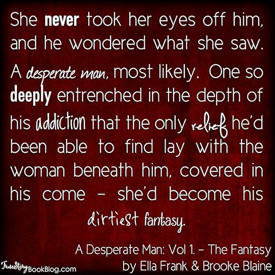 She never took her eyes off him, and he wondered what she saw. A desperate man, most likely. One so deeply entrenched in the depth of his addiction that the only relief he'd been able to find lay with he woman beneath him, covered in his come- she'd become his dirtiest fantasy.